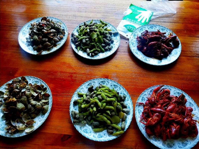 煮上毛豆花生蛤蜊小龍蝦